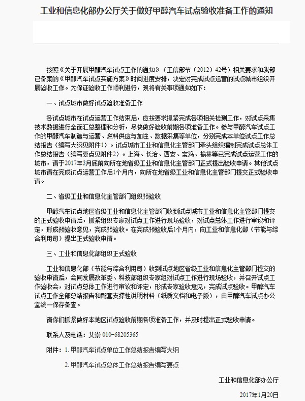 甲醇汽车试点地区省级工业和信息化主管部门收到试点城市工业和信息化主管部门提交的正式验收申请后,抓紧组织专家对试点工作进行现场验收,对试点总体工作进行审议和评定,形成预验收意见,完成预验收。在完成预验收后1个月内,向工业和信息化部提出正式验收申请。