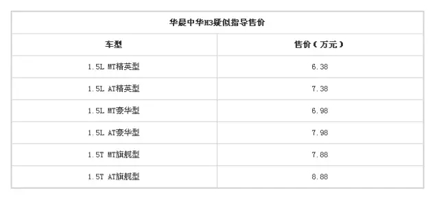 这一次中华H3再次杀入A级车这片红海。日前便有国内相关媒体获取到了华晨中华H3车型的疑似国内指导售价,该车或将于3月3日正式上市。从曝光的信息来看,华晨中华H3将推出搭载2种动力(1.5L/1.5T)的6款车型,疑似价格区间为6.38-8.88万元。