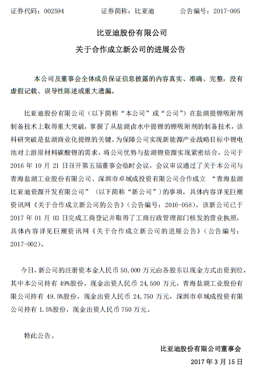 新公司的注册资本金为人民币5亿元,由各股东以现金方式出资到位,其中比亚迪持股 49%,现金出资人民币 24,500万元,青海盐湖工业股份有限公司持股 49.5%,现金出资人民币 24,750 万元,深圳市卓域成投资有限公司持股1.5%,现金出资人民币750万元。 经营范围包括盐湖锂资源的开发、生产与销售,产品包括碳酸锂和氢氧化锂等。而新公司的成立也将为比亚迪在新能源产业战略目标中锂电池对上游原材料碳酸锂的需求提供保障。