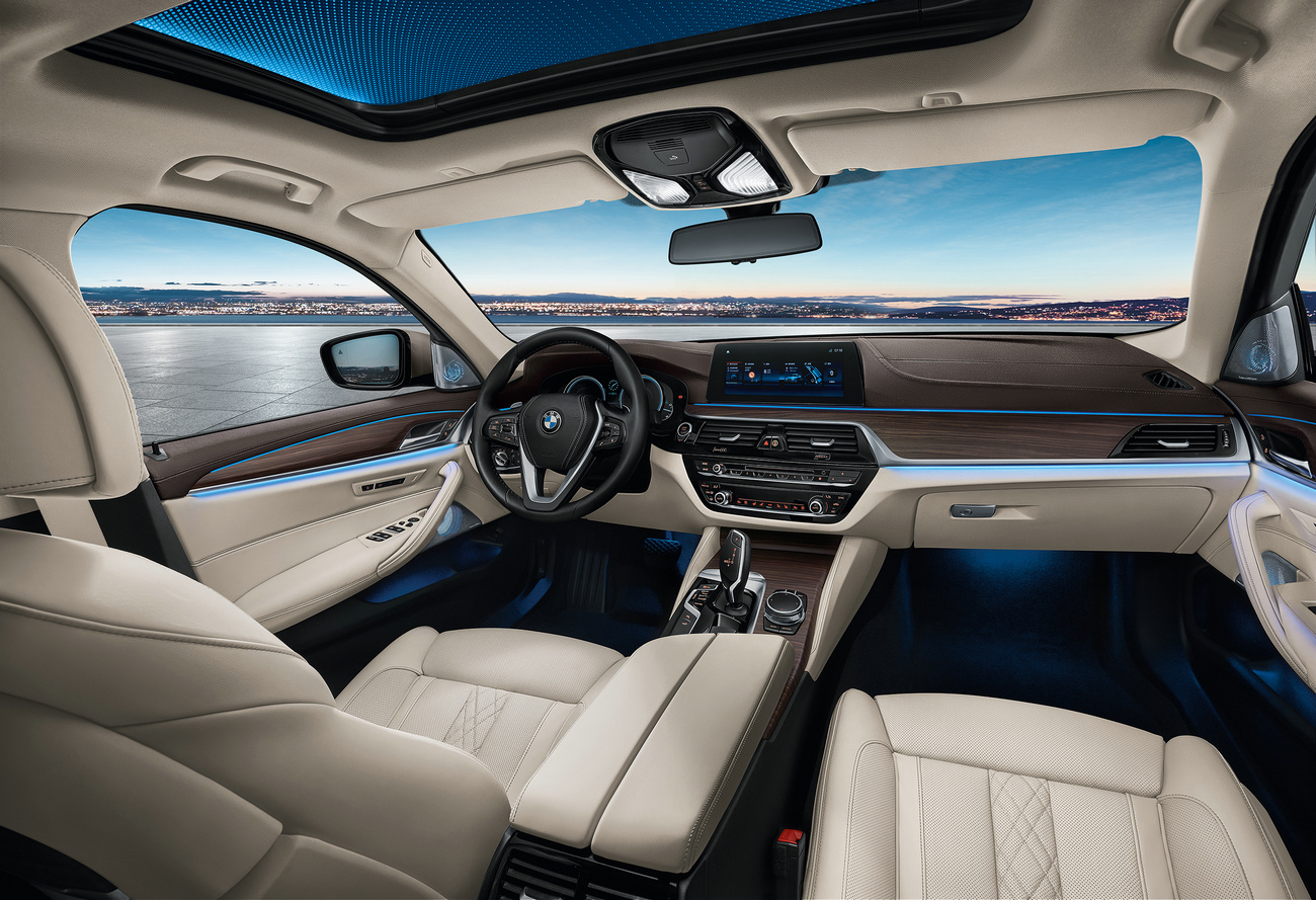 两大设计套装——M运动套装与豪华套装的推出,满足了5系用户对动感时尚或尊贵优雅两种风格的不同偏好。其中,豪华套装进一步突出了华贵尊享的风格。镀铬的进气格栅饰条、前轮罩导流孔以及车窗镶边彰显高贵气质,拉开车门即可见到铝合金迎宾踏板上的 Luxury Line 字样。车内色调雅致的高级Nappa真皮内饰具有顶级柔滑细腻的亲肤触感,座椅上精致入微的缝线工艺映射出追求极致的匠人精神,与特有的木纹装饰映衬出卓然的品味。仪表板以软皮包覆,不但悦目,触感更加舒适。