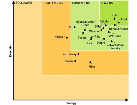 【编者按】近日,一份来自Navigant Research的研究报告为目前正在从事自动驾驶汽车开发的公司进行了排名。该报告引入10项标准来进行量化评分,其中包括:视野、市场策略、合作关系、生产策略、技术能力、销售能力、量产能力、产品质量和可靠性、产品组合能力以及可持续能力。