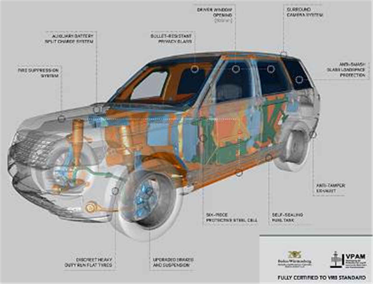 2015年,SVO推出一款防弹防爆车型,命名为揽胜Sentinel(译为哨兵)。为了车辆能够尽量不暴露其重要身份,除了前进气格栅配备有警示灯之外,哨兵与揽胜基本保持一致。车身六块装甲板可抵御7.62mm高速穿甲弹,侧面能抵御15公斤TNT当量的爆炸装置,车顶及车底分别能同时抵御两枚 DM51手榴弹的袭击,防弹规格达到VR8级别。此外,若车门遭受严重攻击受损无法开启时,乘客亦可经由经独家设计的车尾门紧急逃生。