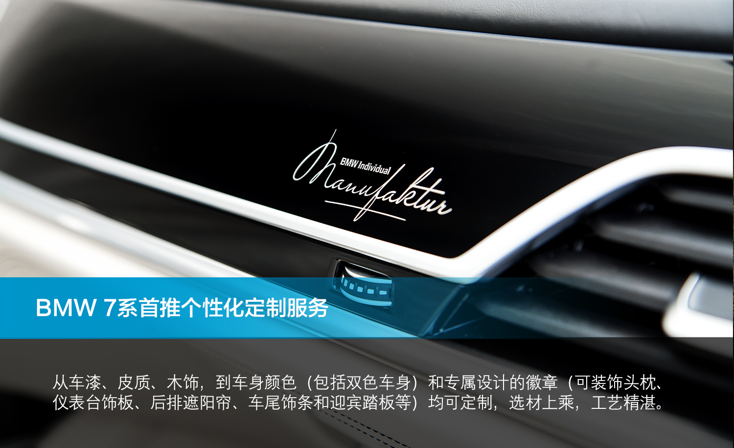 而BMW 7系为您带来的创新,不止于此。除了出行的智能与便捷,BMW 7系也提供了创新的豪华服务体验。作为首个在中国提供完全定制服务的豪华汽车品牌,从选车开始,您就可以享受宝马在BMW 7系上首推的个性化定制服务,从车漆、皮质、木饰,到车身颜色和专属设计的徽章均可定制,打造独一无二的专属座驾。