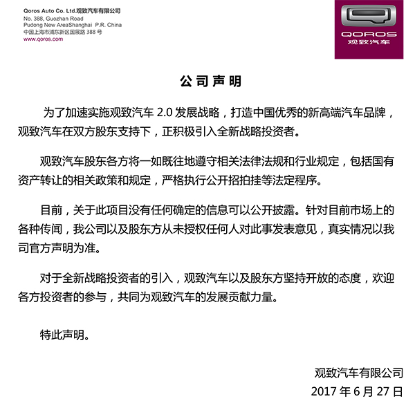 汽车财经网6月28日讯,6月27日,观致汽车对外发表声明,表示:目前关于此项目没有任何确定的信息可以公开披露,观致汽车以及股东方坚持开放的态度,欢迎各方投资者参与,共同为观致汽车的发展贡献力量。