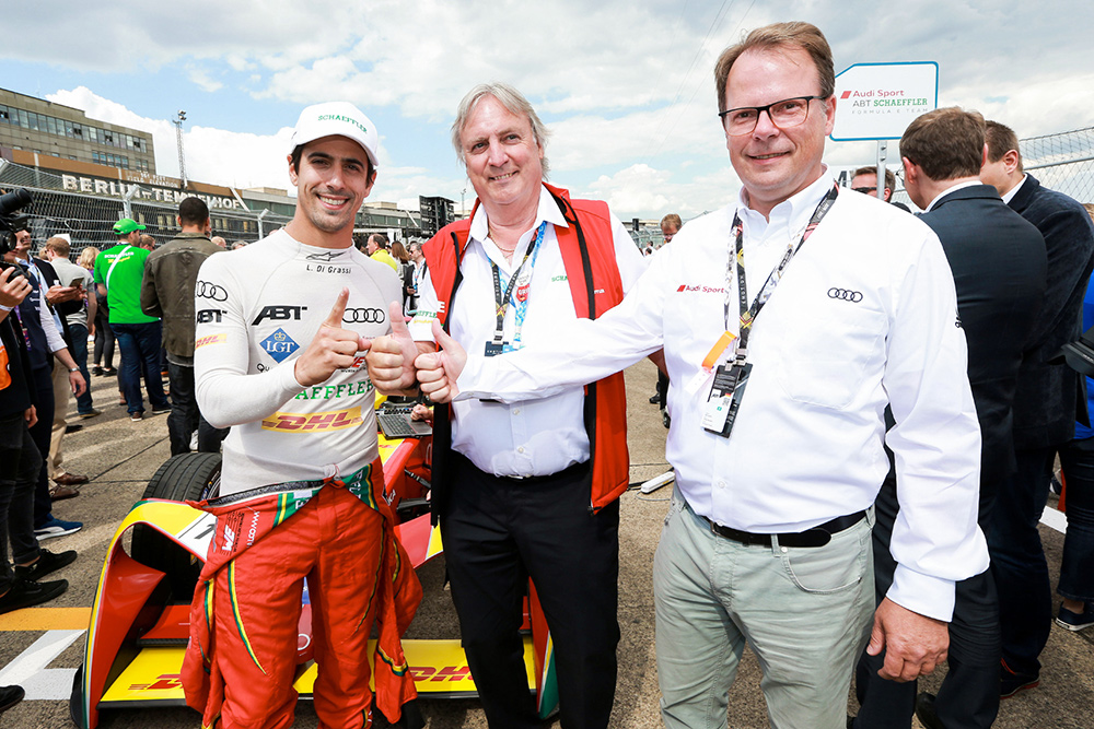 在柏林滕佩尔霍夫区举行的电动方程式锦标赛柏林站。从左至右:ABT舍弗勒FE02赛车手卢卡斯•笛•格拉西(Lucas di Grassi)、舍弗勒集团副首席执行官兼首席技术官彼得•古兹默教授以及奥迪股份公司技术研发管理委员会成员彼得•默滕斯博士