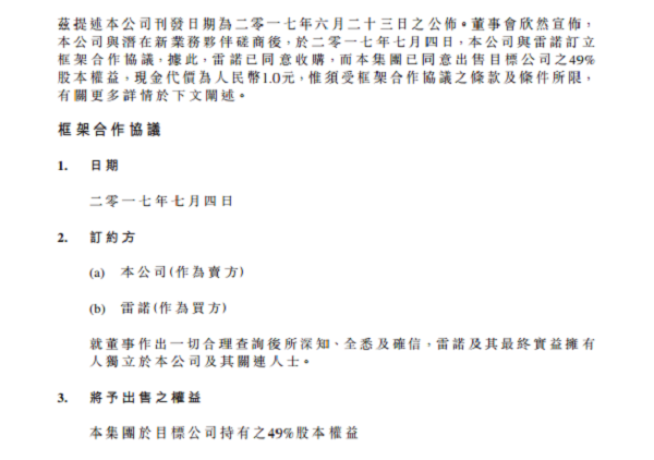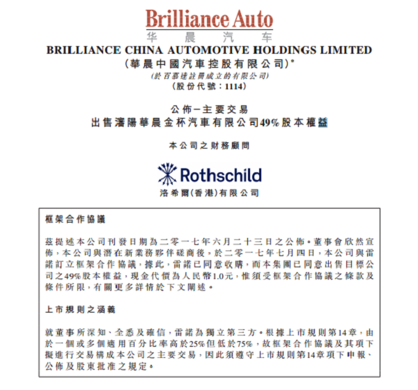 汽车财经网7月5日讯,华晨中国汽车今日发布公告称,7月4日,该公司与雷诺订立框架合作协议,据此,其将向雷诺出售目标公司沈阳华晨金杯汽车有限公司(以下简称“华晨金杯”)49%股本权益,现金代价为人民币1元。