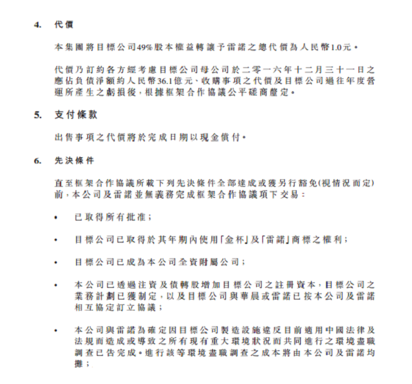 根据协议,此项合作完成后,该公司及雷诺将完成增加目标公司注册资本合共人民币15亿元。其中10亿元将于该等增资之程序完成及目标公司获发新营业执照以反映该等增资后,由公司及雷诺按彼等各自所持目标公司股权比例支付;另外5亿元将于完成后12个月内,由公司及雷诺按彼等各自所持目标公司股权比例支付。