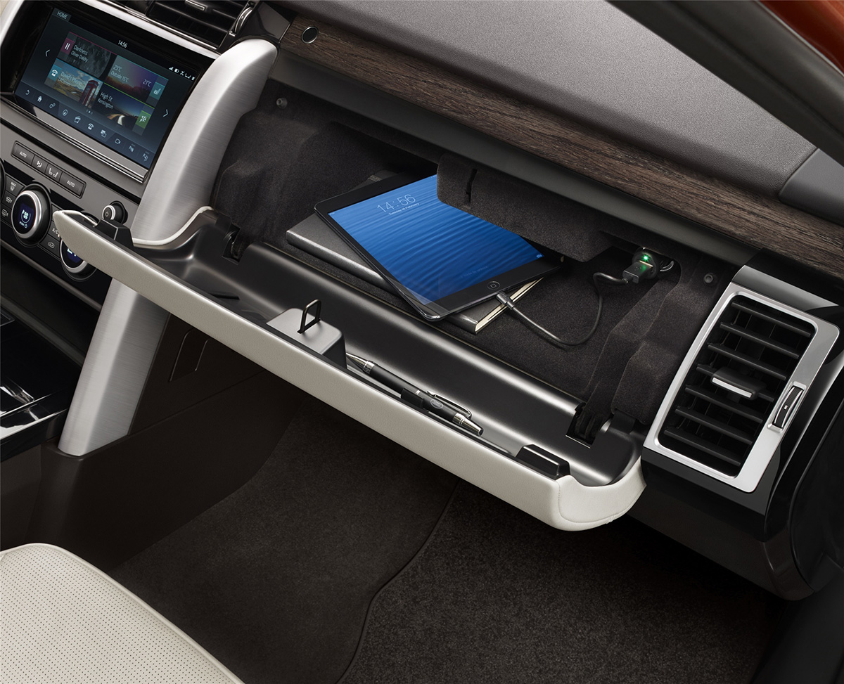 即使在七个座椅全部打开的情况下,全新一代发现仍可容纳一个高尔夫球包或三个拉杆旅行箱,在后两排座椅全部折叠后,更可呈现2500升的超大载物空间。储物同样便利十足,位于中控台的隐藏式储物盒能够收纳四台iPad平板电脑,中央扶手箱还可同时放置五台;零碎物品可以安放于隐藏式小物品储物单元格中,而副驾驶座位脚窝处的按压开启式手提袋挂钩,则带来“四两拨千斤”的方便与巧妙。