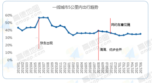 5公里内驾车出行比例下降。从2016年10月开始,全国近百个城市相继发布网约车新政。随即多个城市拥堵均有小幅下降,政策影响初显。而伴随今年网约车新政的逐步落地实施,城市内短途(5km内)出行比例也在逐渐下降,从2015年6月的57.1%逐步下降到目前的34.7%。