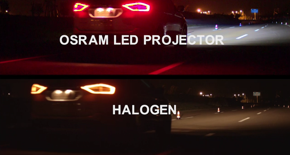 欧司朗LED大灯系统魄晓者(上)与卤素大灯效果对比(下)
