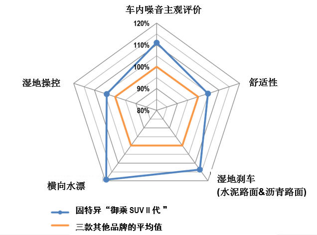 “御乘 SUV II代”在湿地操控、横向水漂、湿地刹车、舒适性、车内噪音主观评价上与主流竞争对手的对比