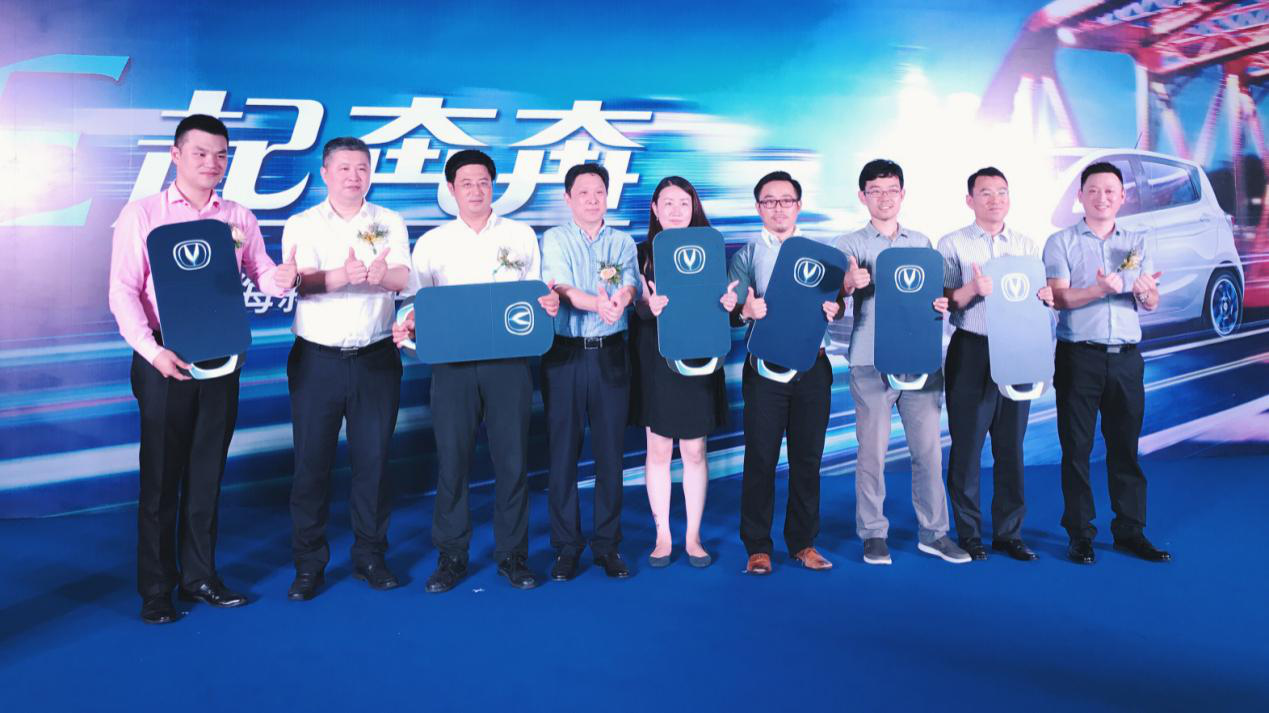 长安汽车领导现场将车钥匙交付到格灵出行领导手中,并欢迎他们加入长安汽车大家庭。随后,厂家和客户一同在龙门架前举行了发车仪式,鸣锣发车,新奔奔EV组成的车河缓缓驶出,融入了格灵出行共享新能源汽车的大河中。