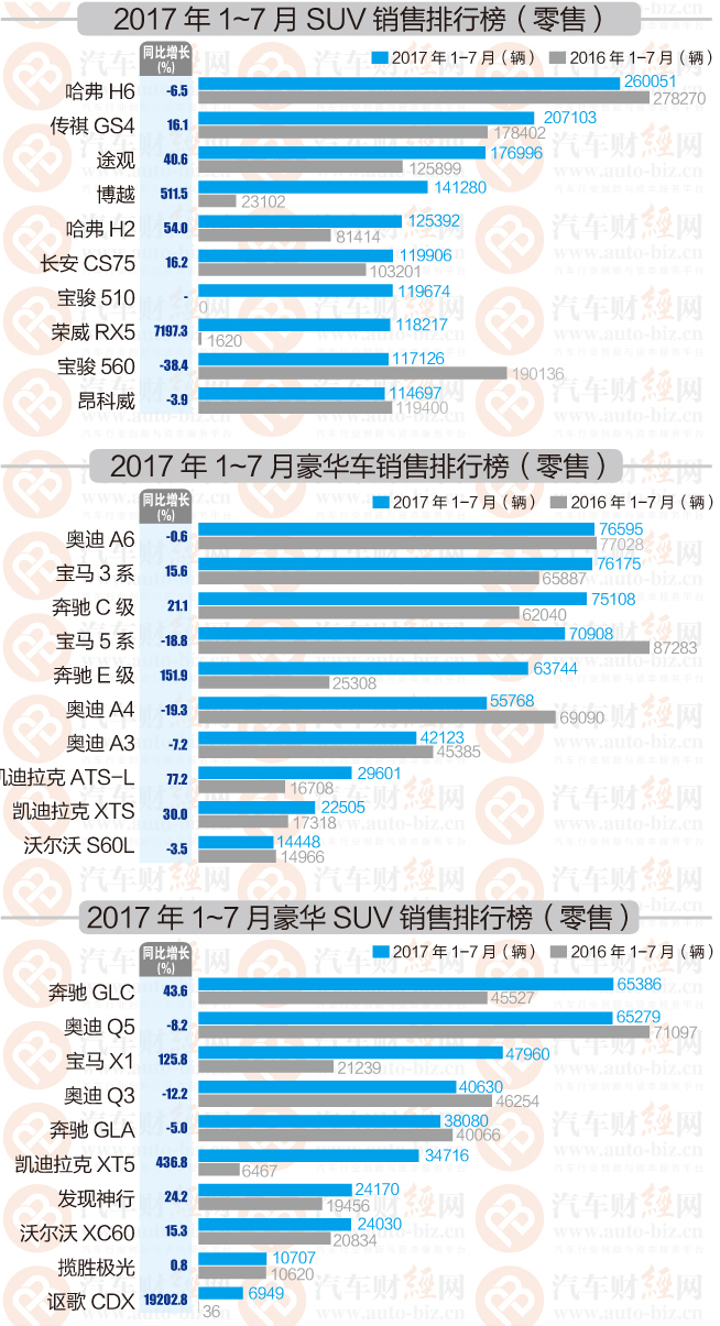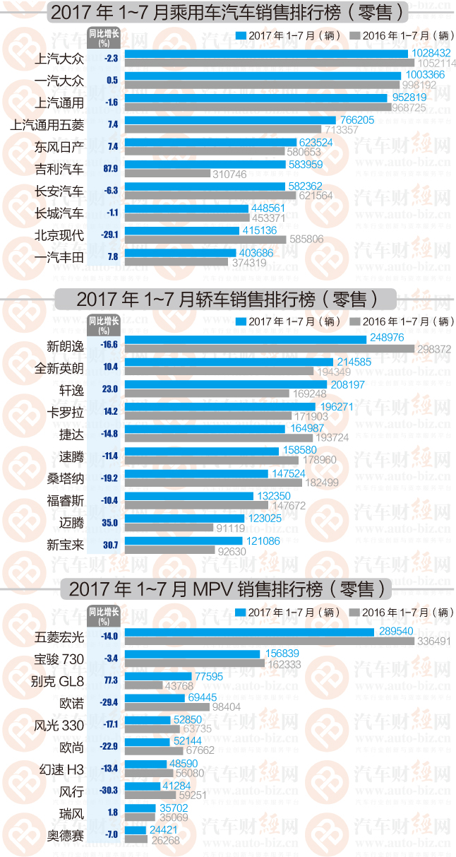 【销量】2017年1~7月国内各类新车销售排行榜(零售)