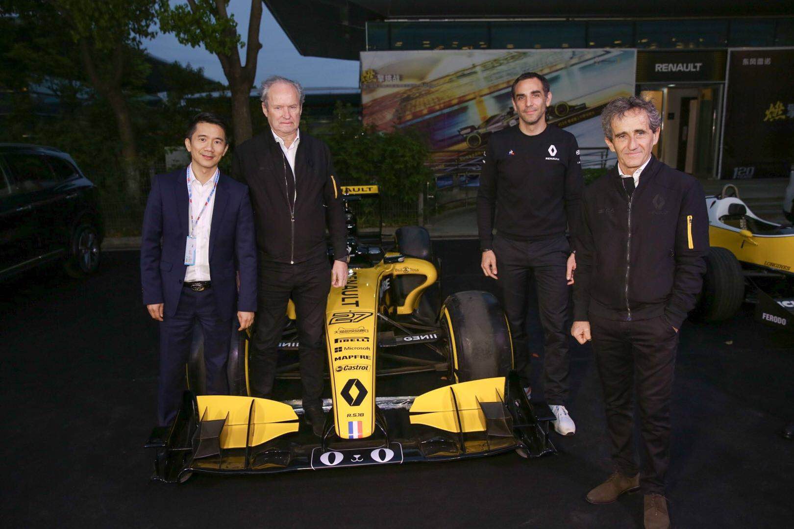在F1中国大奖赛开赛前夕雷诺2018F1最新战车R.S.18首次在赛场亮相。这款车搭载了全球合作伙伴天猫的Logo。图为(从左到右)阿里妈妈事业部全域媒体业务中心总经理林文威、雷诺运动赛车部总裁杰罗姆•斯托尔、总经理西瑞尔•阿比特波尔、4次世界冠军兼总裁特别顾问阿兰•普罗斯特