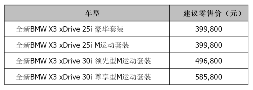 上市初期将提供BMW X3 xDrive 25i和BMW X3 xDrive 30i两种车型,每种车型提供豪华套装和M运动套装两种选择。这些车型不仅是脱胎换骨的新车,还是高配置和高价值的典范。“迎宾光毯”、10.25英寸智能触控中央显示屏、自然语音识别系统、感应式电动尾门等高级配置数不胜数,还有专为中国客户设计的舒适后排座椅,以及同级最大全景天窗、智能自适应LED大灯、PM 2.5空气滤清器等20余项高价值装备全系标配。创新感、豪华感和价值感让新车极具吸引力和竞争力。面向中国社会那些独立、自信且富有责任感的成就者,全新BMW X3将成为新的豪华理念和现代生活方式的理想之选。