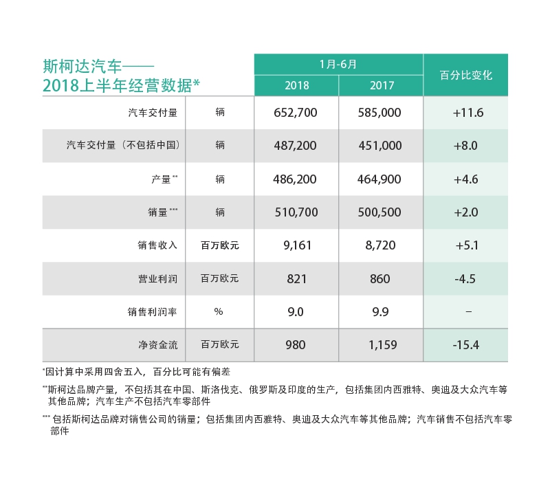 2018年1到6月份,斯柯达销售收入达91.61亿欧元,增长5.1%(2017年上半年:87.20亿欧元)。同期营业利润为8.21亿欧元,下降4.5%(2017年上半年:8.60亿欧元);销售利润率9.0%( 2017年上半年:9.9%)。净现金流总额为9.80亿欧元(2017年上半年:11.52亿欧元)。