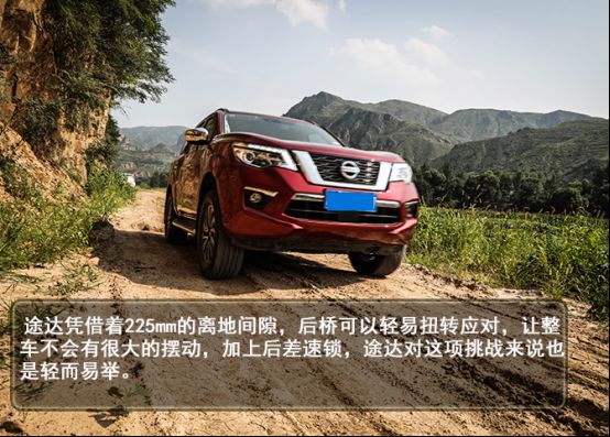 虽然途达可以顺利通过这项挑战,但是在挑战过程中摇晃得厉害,并且途达轴距的长度会影响通过性,好在悬挂支撑很到位,四轮都尽可能地贴合路面。