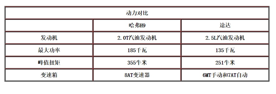 通过对哈弗H9和途达的对比,虽然途达起价更低且有手动挡车型降低了门槛,但哈弗H9在动力总成的优势明显,关键是还有更省油扭矩更大的柴油2.0T发动机车型可选,并且哈弗H9比途达配置丰富且有7座车可选。而且在越野性方面,哈弗H9也是稳占上风。
