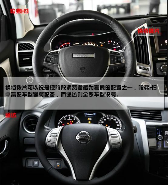 单从数据对比中我们发现,在动力方面,哈弗H9的动力比途达强劲不少。而在变速器方面,哈弗H9的变速器比途达变速器先进,且换挡更加平顺,不过途达7AT也算够用。