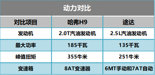 单从数据对比中我们发现,在动力方面,哈弗H9的动力比途达强劲不少。而在变速器方面,哈弗H9 ZF-8AT的变速器比途达变速器先进,且换挡更加平顺,不过途达7AT也算够用。