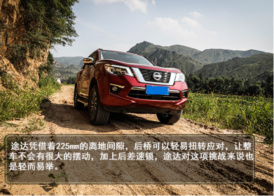 虽然途达可以顺利通过这项草地加泥地的挑战,但是在挑战过程中摇晃得厉害,并且途达轴距的长度会影响通过性,好在悬挂支撑很到位,四轮都尽可能地贴合路面。虽然途达的离地间隙较高,但是侧边踏板和没有任何防护板的底盘,都是影响通过性的因素。