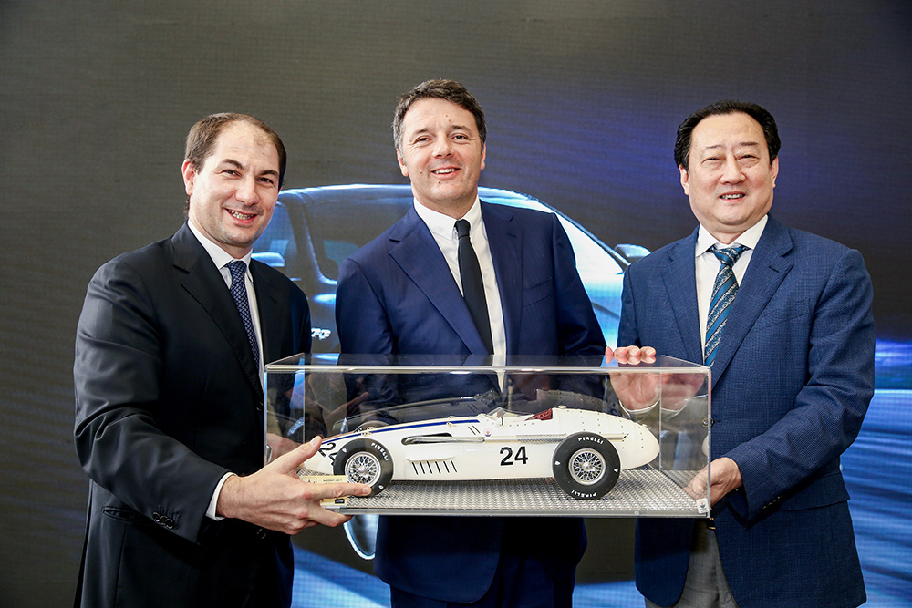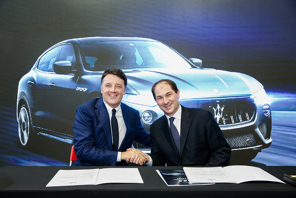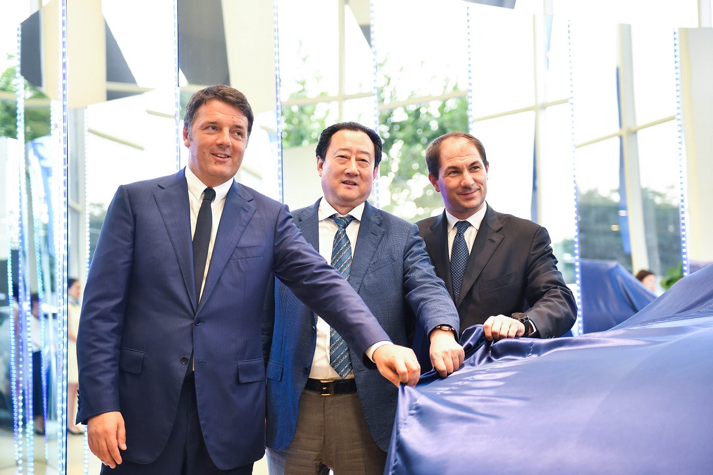 伴随着玛莎拉蒂中国首席培训师为来宾详细讲解这款神秘车型的过人之处及一段激情澎湃的现代小提琴演奏后,整个活动进入了高潮,意大利第41届总理马泰奥•伦齐(Matteo Renzi)先生、广汇汽车集团董事长李建平、玛莎拉蒂中国总经理艾伯特∙卡瓦乔内(Alberto Cavaggionni)共同为玛莎拉蒂全新限量版高性能SUV LevanteTrofeo揭幕并为上海亚欧未来的前三位Trofeo车主授信签名。