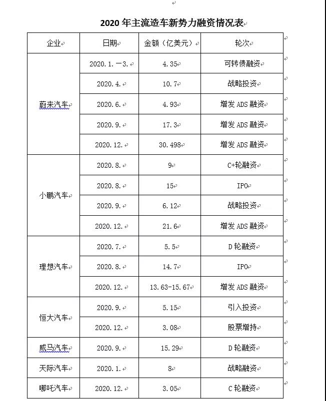 随着7月之后造车新势力“三杰”市场业绩连创新高,促进了其余造车新势力哪吒、威马、天际、恒大等接连传出获得融资和抢滩科创板的捷报。2020年全年,新能源汽车(主要是造车新势力)融资总额已破千亿元人民币。与此同时,新势力也撞破了成长道路上的生死线。最近的新秀是百度,到今年2月9日美股盘中曾触及304美元,涨幅10%。市值过千亿美元,超过了蔚来600亿。