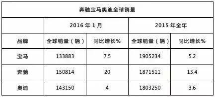 此外,如今的宝马正在不断受到来自于奔驰的挑战,下面是2016年1月以及去年的宝马和奔驰的全球销量对比,附带上奥迪。
