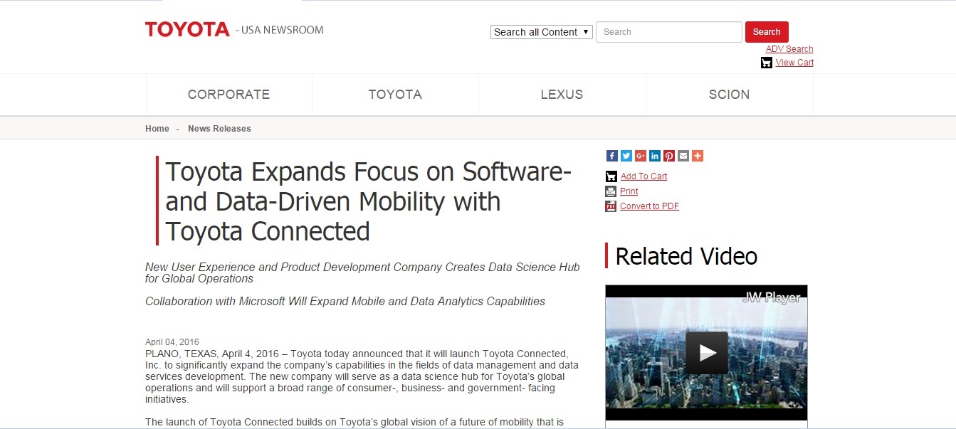 Toyota Connected将会利用微软云计算平台Azure处理、管理和分析数据,在现有的基础上为驾驶员、车队以及经销商提供更新的服务。