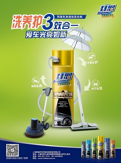 拜恩全系列产品均采用德国先进科技,经数位资深行业专家历时多年研制而成,通过了ISO9001质量体系认证和ISO14001环境管理体系认证,内含高分子技术材料,洗养护三效合一,改变了洗、养、护分开完成的传统洗车方式。拜恩全系列六款产品包含车身清洁亮光剂、内饰专用清洗剂、玻璃专用清洗剂、强力专用清洗剂、皮革去污上光剂、轮胎清洁增黑剂,为您爱车洗养护全方位的“洗养护”产品。