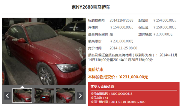 此外,一辆在上一次竞拍中以231,000.00元结束竞价的宝马,在其“处置公告”内所写的“重大瑕疵情况车身车灯处有划痕,车辆除外观及上述公布情况外的其他状况不明”,购得该车的竞拍者显然已经默默接受了。诸如此类模糊不清的信息在其它竞拍车辆上也同样普遍。