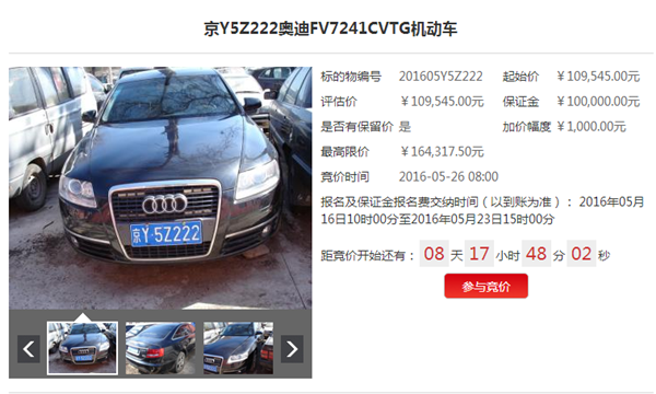 5月16日,一轮不同寻常的带牌车辆“拍卖会”在北京开启(拍卖网址http://ssxkc.cbex.com.cn/jcas)。这些车辆身份特殊,为刑事、民事、商事案件中查封、扣押的车辆。而上一次的拍卖时间为2014年11月。