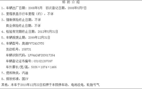 笔者登录北京产权交易所网站发现,一辆起拍价为109,545.00元的奥迪,在标的物的调查情况表中,车辆的信息十分含糊,行驶里程、交强险一栏的信息均为“不详”;“其他”一栏的信息显示为:“本车于2010年12月22日扣押于本院停车场,电池没电,轮胎亏气”。