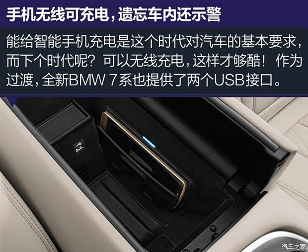 不知道您平时上车之后手机会放在什么地方?其实这是 现在车主都会碰到的情况,手机无论放在哪都不是最合 适的,都难免在刹车或加速的时候磕碰。 所以我们能看到一个非常有意思的矛盾:人们可以有最 先进的手机,也可以拥有最豪华的车辆,但当两者碰到 一起的时候,却未必能提供真正便捷的体验。 这就是为什么我们在中央扶手内特别设计了一个专属的 手机夹,把手机放进去的时候会看到蓝灯亮起,说明它 正在充电。这就是7系的无线充电技术,也是豪华车首次 引入一种叫做近场通信的技术。 这样一来,既不用担心手机磕碰,也摆脱了充电线的困 扰。真正的豪华,就应该能够带来这种便捷的体验。