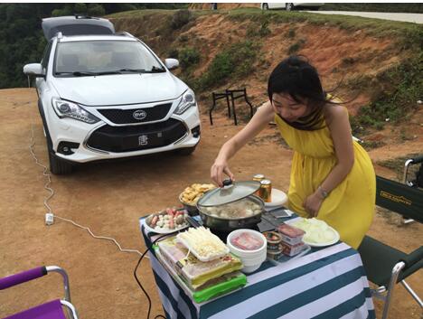 说得形象一点,它就好比一个大号的万能充电宝。一家三口外出郊游,一部车、一个电磁炉、一个烤盘,一大包新鲜食材,“妈妈再也不用为无法生火做饭而发愁了”。火锅、烧烤随时走起,如果有更多需求,它甚至可以为露营照明灯提供电力。看着其它人为生火忙得焦头烂额一脸灰的时候,比亚迪车主的画风却是“吃着火锅唱着歌,麻将刚好凑两桌”。