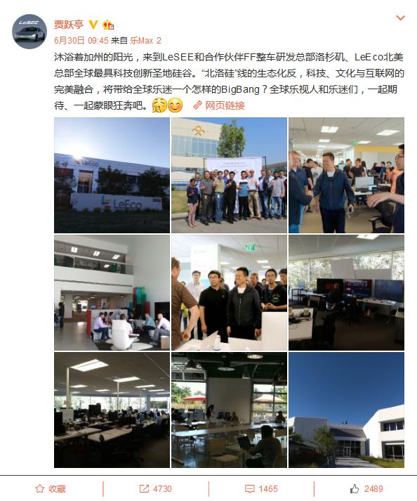 昨天,贾跃亭的微博上发布了几张图片,展示了他在美国访问的场景,引发强烈反响。除了贾跃亭首次亮相乐视美国总部之外,一张汇集众多大咖的合影也格外引人注意。仔细一看,在这张拍摄于乐视战略合作伙伴Faraday Future(简称FF)总部门前的照片中,乐视创始人兼董事长,乐视控股CEO贾跃亭、乐视超级汽车联合创始人、全球副董事长丁磊等乐视高管,以及FF研发与工程高级副总裁Nick Sampson、新晋从特斯拉加盟的FF政府关系副总裁兼总顾问James Chen、FF全球制造副总裁Dag Reckhorn,以及FF自动驾驶团队成员悉数在列,可谓阵容豪华。