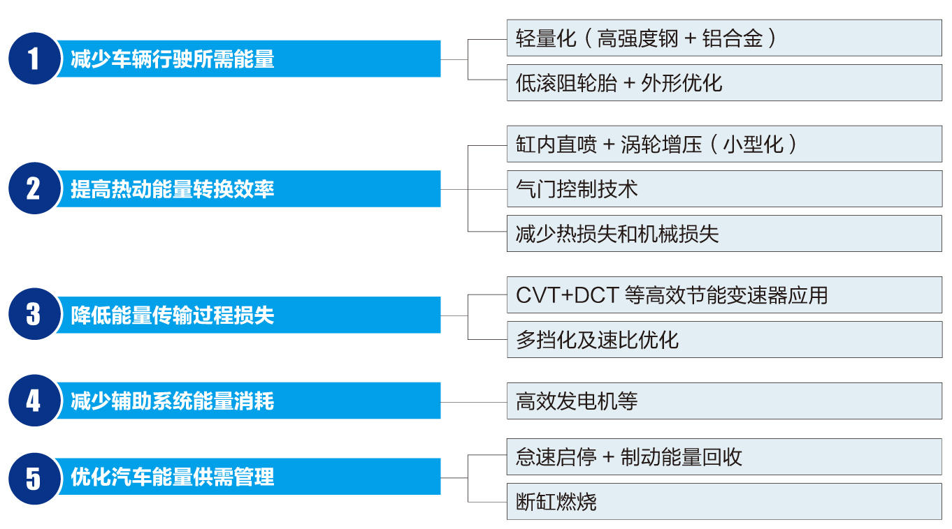 对于燃油汽车的节能减排,随着近十几年来发动机电控技术的发展、轻量化技术推广及机外循环技术的发展等,确有很大潜力可控,以下为实现2020年百公里5L油耗目标,可选用的技术项目一览: