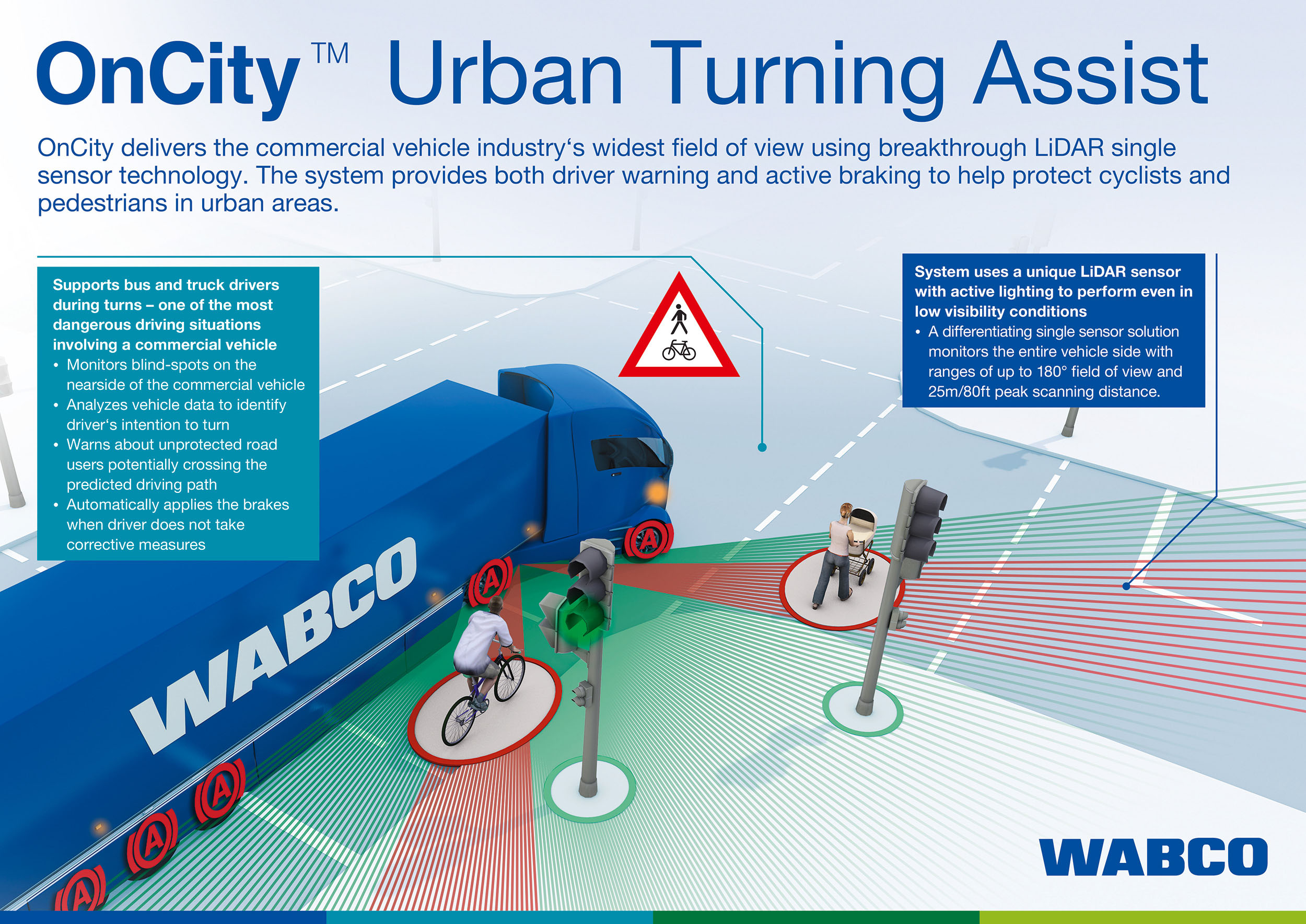 全新威伯科OnCity先进驾驶辅助系统专为卡车、公交车、牵引车和挂车设计,拥有业界最宽广的高达180度的视角,使用单个传感器进行安全监测,可帮助保护位于车辆盲区的弱势道路使用者。是商用车行业首个利用LiDAR(镭射激光)技术进行目标检测的防撞系统。