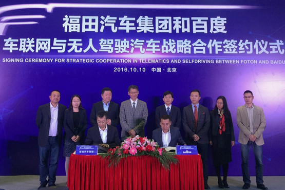汽车财经网10月10日讯,今日,福田汽车集团在北京与百度签署战略合作协议,将就车联网、大数据、智能汽车和无人驾驶展开全面合作,共同打造面向未来的智能互联网商用汽车。