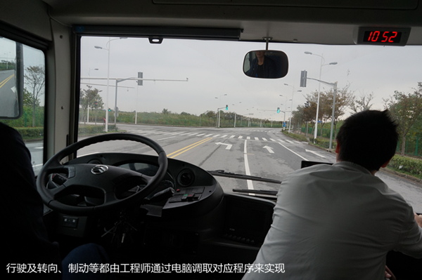 笔者所试乘的这辆经过改装的金龙小巴由电力驱动,动力系统来自国内的供应商。由于主要演示执行层,当天并未安装摄像头等传感器,行驶及转向、制动等都由工程师通过电脑调取对应程序来实现。从车辆对程序的响应来看,无论是加速、转向、制动都能够顺利完成。特别是紧急制动给试乘的每一个人都留下了深刻的印象。