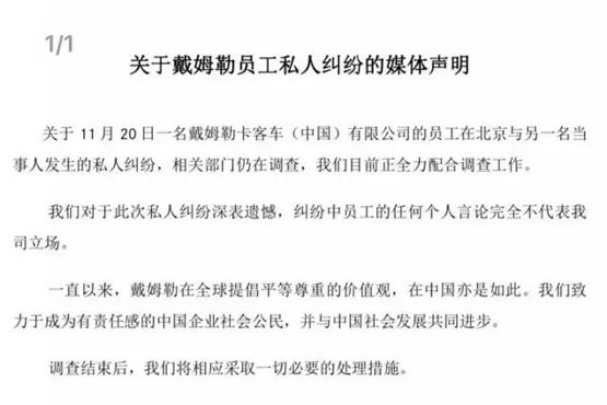 戴姆勒表示:关于11月20日一名戴姆勒卡客车(中国)有限公司的员工在北京与另一名当事人发生的私人纠纷,相关部门仍在调查,我们目前正全力配合调查工作。我们对于此次私人纠纷深表遗憾,纠纷中员工的任何个人言论完全不代表我司立场。调查结束后,我们将相应采取一切必要的处理措施。