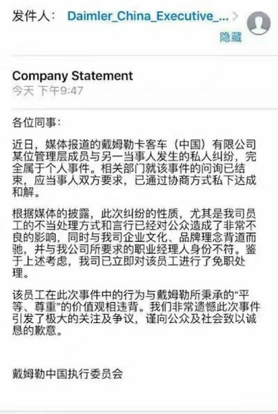或许是迫于舆论压力,戴姆勒当晚又发布第二份声明,在这份声明中,戴姆勒方面表示,近日,媒体报道的公司某位管理层成员与另一当事人发生的私人纠纷,完全属于个人事件。相关部门就该事件的问询已结束,应当事人双方要求,已通过协商方式私下达成和解。