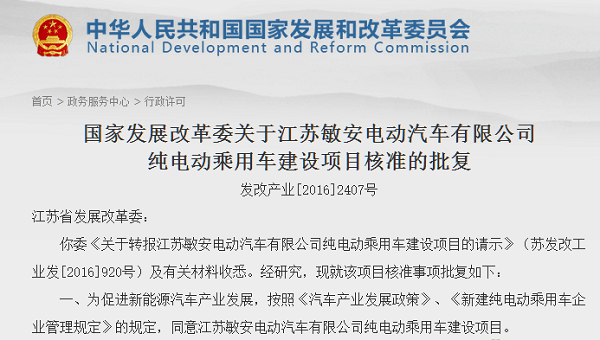 发改委正式批复江苏敏安纯电动乘用车项目 第五张新能源牌照板上钉钉