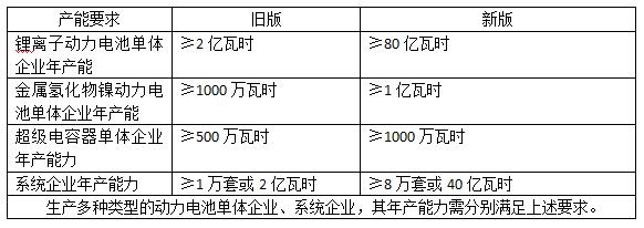 第二,产能要求极其大幅提高。新版规定,锂离子动力电池单体企业年产能力不低于80亿瓦时,金属氢化物镍动力电池单体企业年产能力不低于1亿瓦时,超级电容器单体企业年产能力不低于1千万瓦时。系统企业年产能力不低于80000套或40亿瓦时。生产多种类型的动力电池单体企业、系统企业,其年产能力需分别满足上述要求。