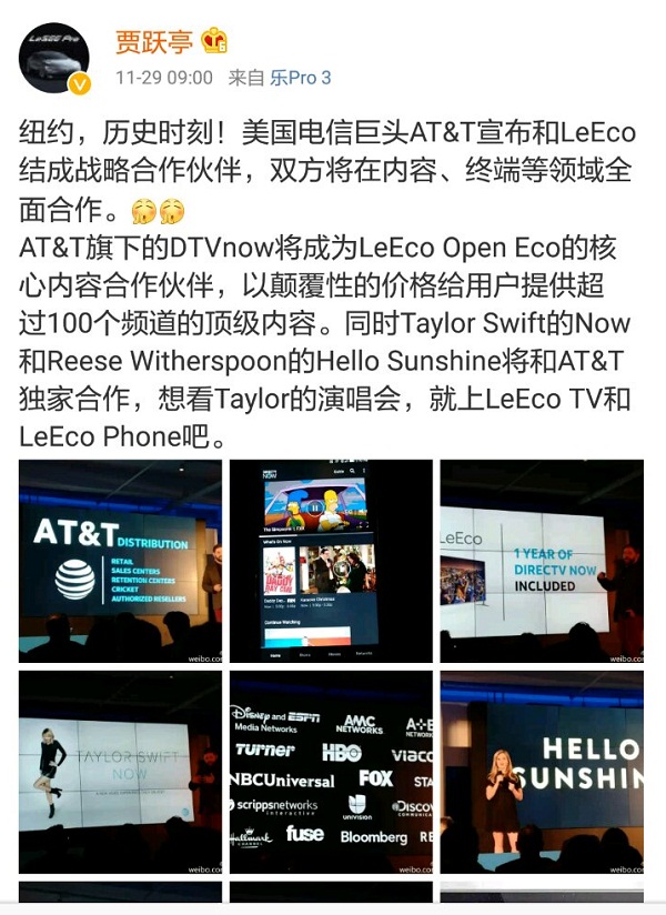 今日上午,贾跃亭发微博表示,美国电信巨头AT&T宣布和LeEco结成战略合作伙伴,双方将在内容、终端等领域全面合作。