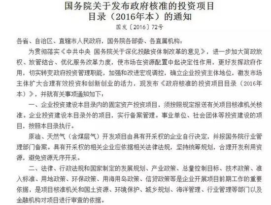 据悉,此次修订《投资项目目录》是继2013年、2014年两次修订后,国务院第三次作出修订。此次修订《目录》,共取消、下放17项核准权限,其中,取消核准改为备案2项、下放地方政府核准15项。